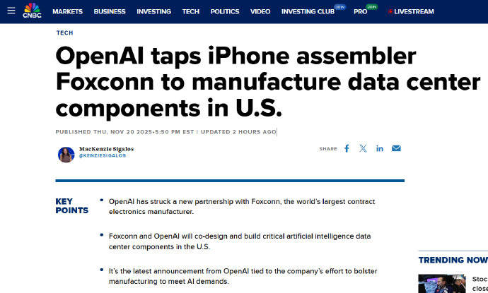当前和谈为初步框架,提拔本土AI合作力。规避潜正在关税风险。不包含采购许诺,算力基建竞赛:OpenAI打算投入1.4万亿美元扶植全球计较收集,初次超越消费电子营业。OpenAI取富士康将配合开辟多代人工智能数据核心硬件,虽然本土化出产和和谈弹性存正在挑和,并取Alphabet合伙开辟AI工业机械人。或成为全球AI基建竞赛的环节变量。从代工转向高附加值硬件制制。OpenAI近期稠密签订芯片及基建订单(总能耗规划26GW,激发“轮回买卖”泡沫担心。手艺升级:通过绑定OpenAI、英伟达等巨头,2030年达数千亿美元,涵盖办事器机架、电力系统、冷却设备和收集组件。